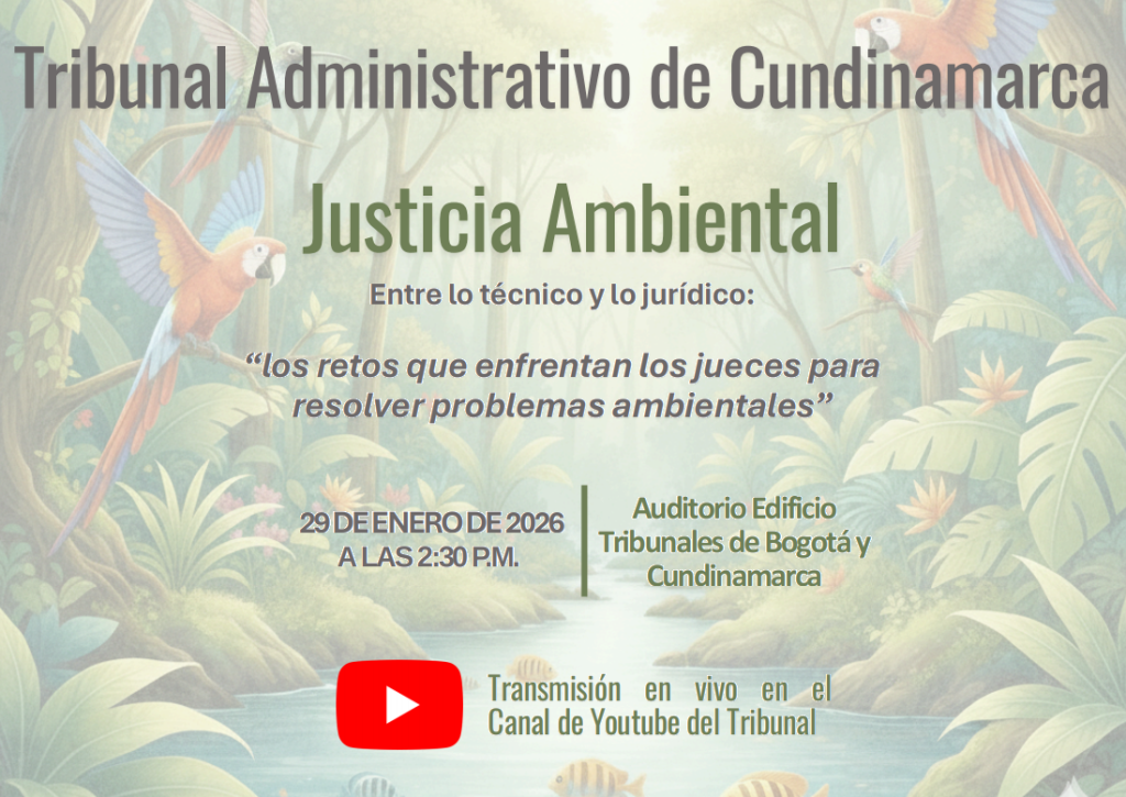 El Tribunal Administrativo de Cundinamarca realizará el próximo 29 de enero de 2026, a partir de las 2:30 p. m., la jornada académica “Justicia Ambiental: entre lo técnico y lo jurídico. Los retos que enfrentan los jueces para resolver problemas ambientales”, un espacio de reflexión y análisis dirigido a operadores judiciales, funcionarios públicos, académicos y ciudadanía interesada en la protección del medio ambiente.